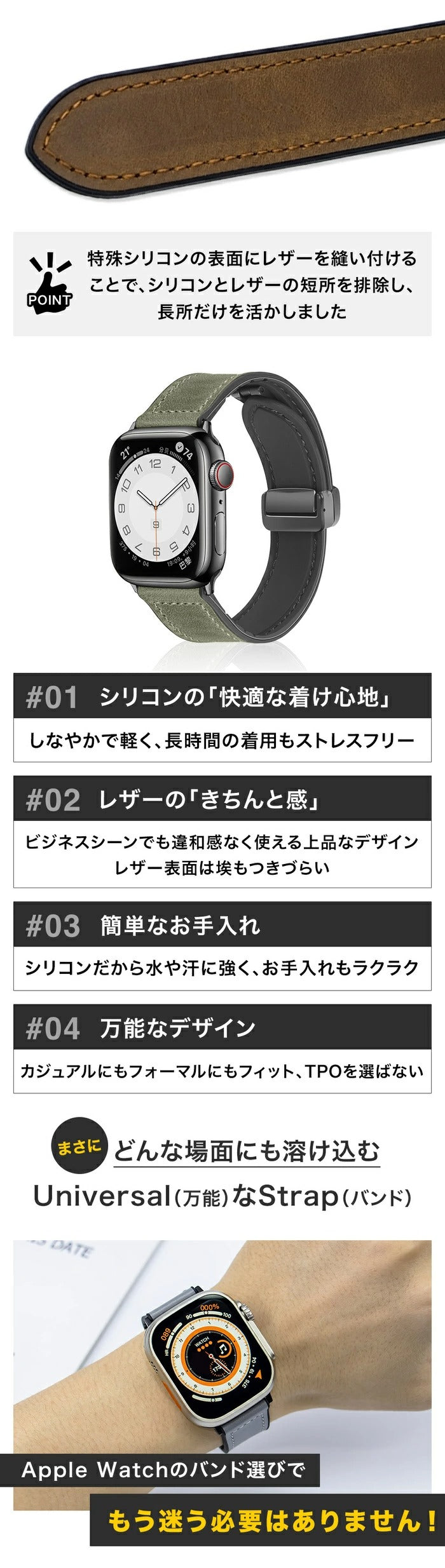 | 商品名 | 【シリコン派にもレザー派にも刺さる1本】アップルウォッチ バンド メンズ 革 レザー レディース apple watch バンド レザー マグネット アップルウォッチ シリコン 軽い ラバーベルト applewatch ベルト 44 45 49 40 41 42 46 ビジネス 男性用 11 10 9 8 7 6 5 4 |