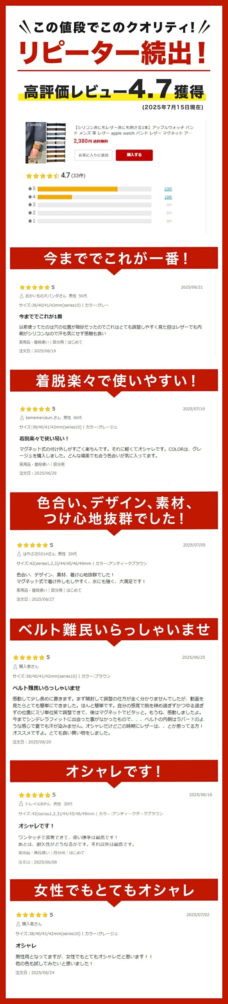 | 特徴 | アップルウォッチ ユーザーが一度は迷ったことがある,レザーバンドにしようかシリコンバンドにしようか?その永遠の課題を解決する アップルウォッチ バンド販売します! シリコンの表面にレザーを縫い付けることにより、シリコンとレザーの短所それぞれで補い、長所のみを生かした全く新しい アップルウォッチ バンドがUnistrapです |