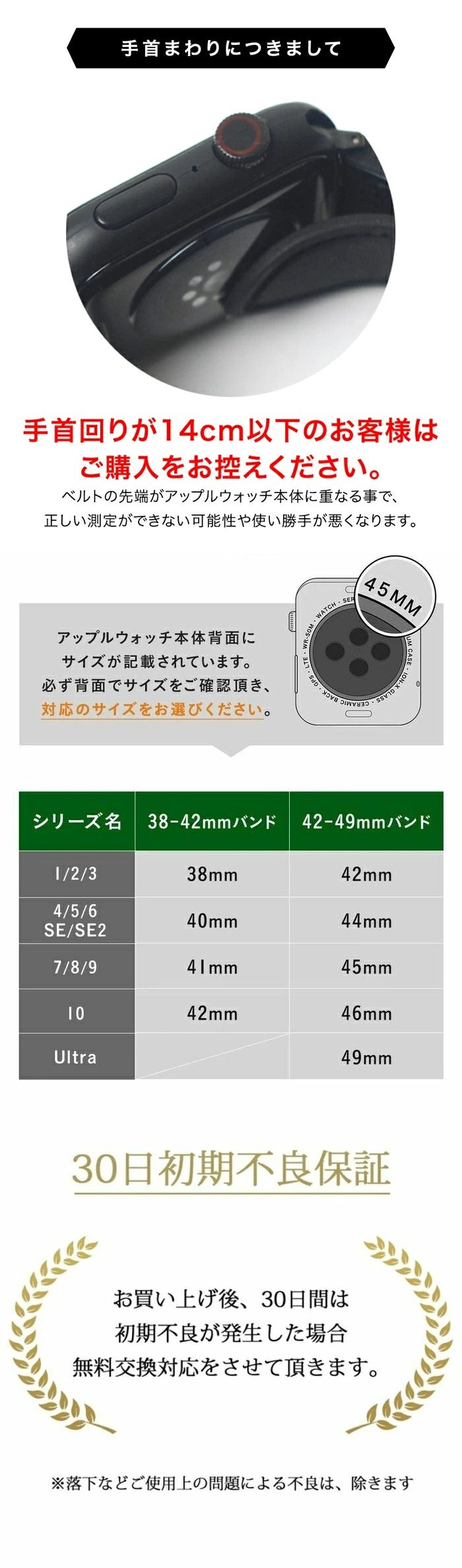 | 注意 | ※お使いのスマホやPCのモニター、また屋外と室内など光の当たり方によって色が異なって見える場合がございます。 ※Apple watch本体は付属しません。 ※商品の使用が原因で起きた時計本体や付属部品の故障、破損等は保証いたしかねますので、ご了承ください。 ※製造時期により商品の色味や伸縮性、質感が異なる場合がございます。また伸縮性のある素材の特性上、個体差により長さが多少前後する場合があります。恐れ入りますがご了承ください。 ※商品の性質上、バックルの色変更はできません。 |