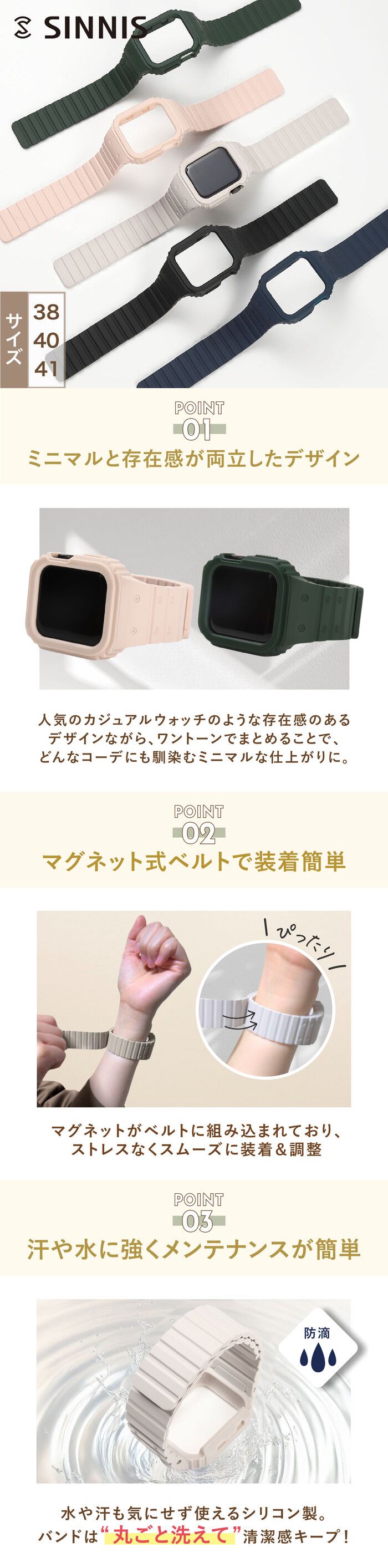 | 特徴 | SINNISの人気のApple Watch シリーズに、カジュアルな一体型バンドが登場しました! アップルウォッチの雰囲気を変えたい!ファッションのポイントにしたい!そういった声にお応えするアイテムです。 素材にはTPU素材を用い、存在感ある雰囲気に仕上がっています。 |