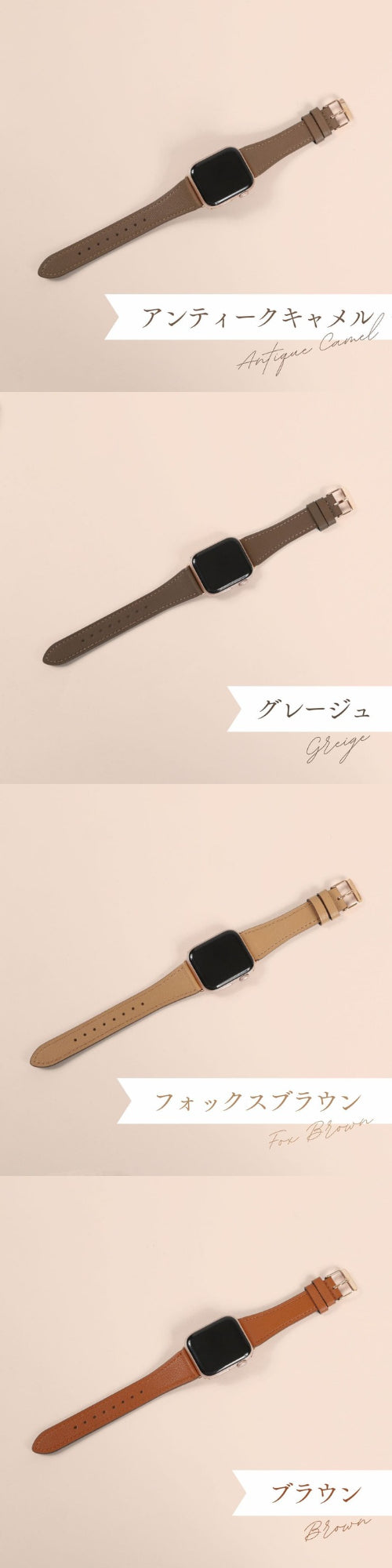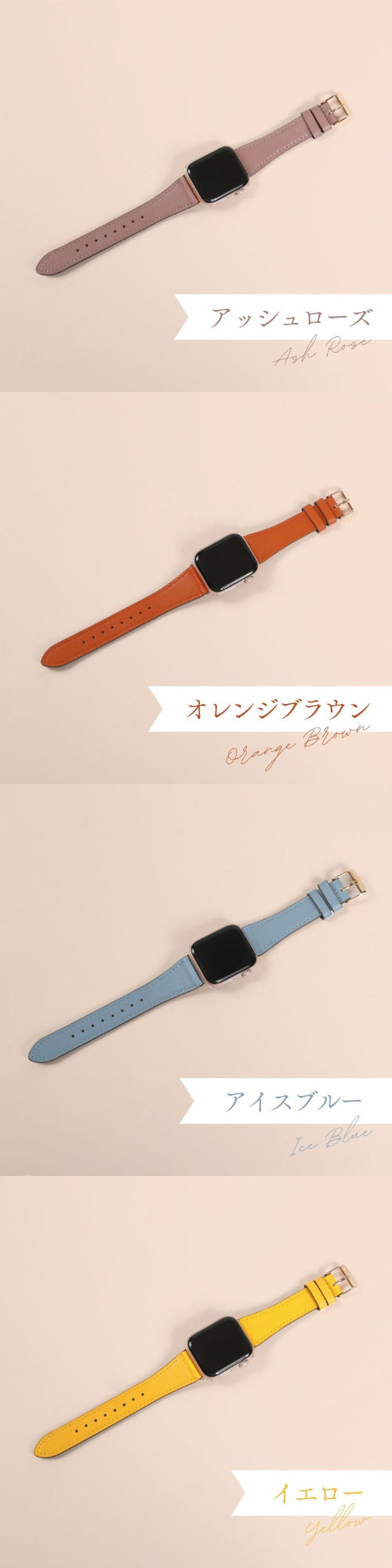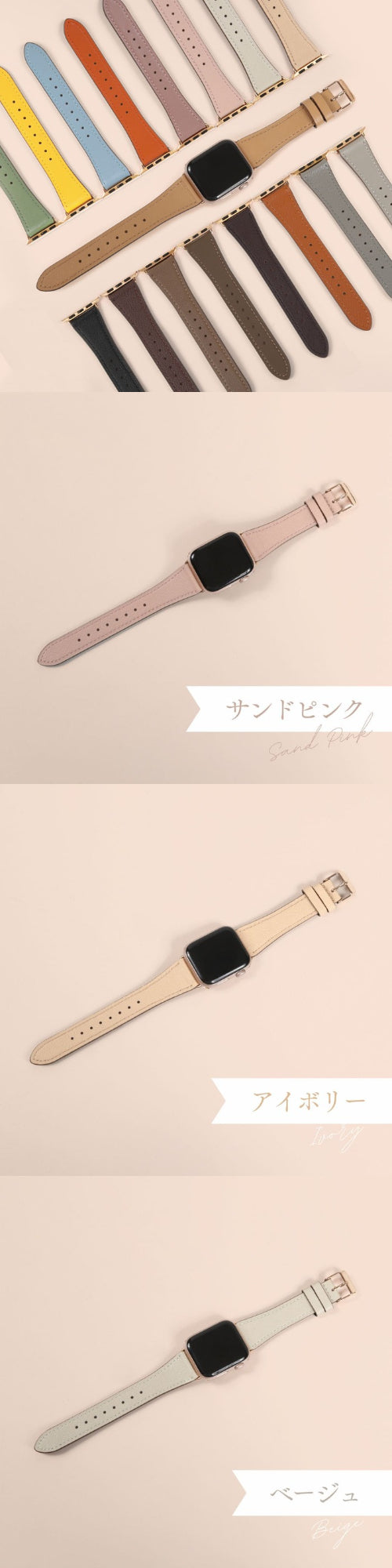 | 特徴 | アップルウォッチを、よりおしゃれに女性らしくするためのバンド。 イタリア製本革を使用した高級感あふれるベルトで人気です 1)大人っぽいくすみカラーをメインに多色展開 2)レザーは本革で耐久性もOK 3)プライベートだけでなく、ビジネスでもお使いいただけます 4)金具は、雰囲気の違うピンクゴールド・シルバーの2色展開 |